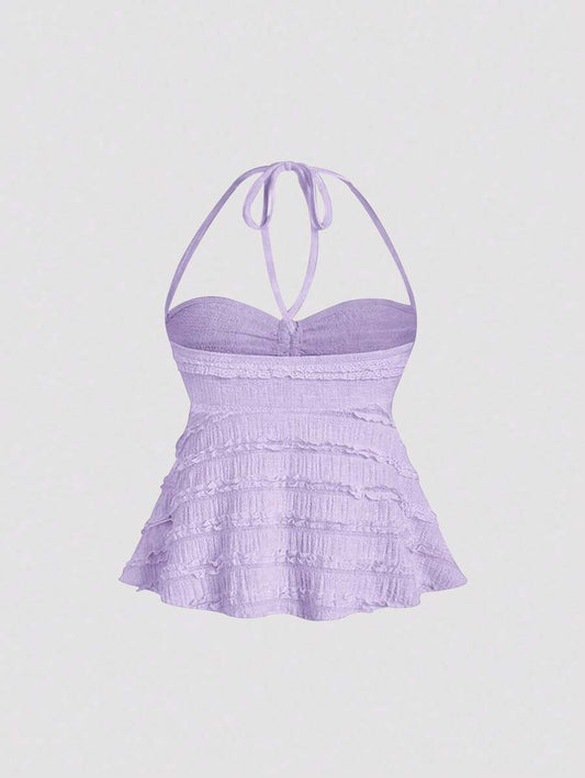 SHEIN PETITE Top de tirantes sexy de espalda descubierta con cuello de cordón, volantes y textura de tejido de punto color albaricoque para mujeres de talla pequeña