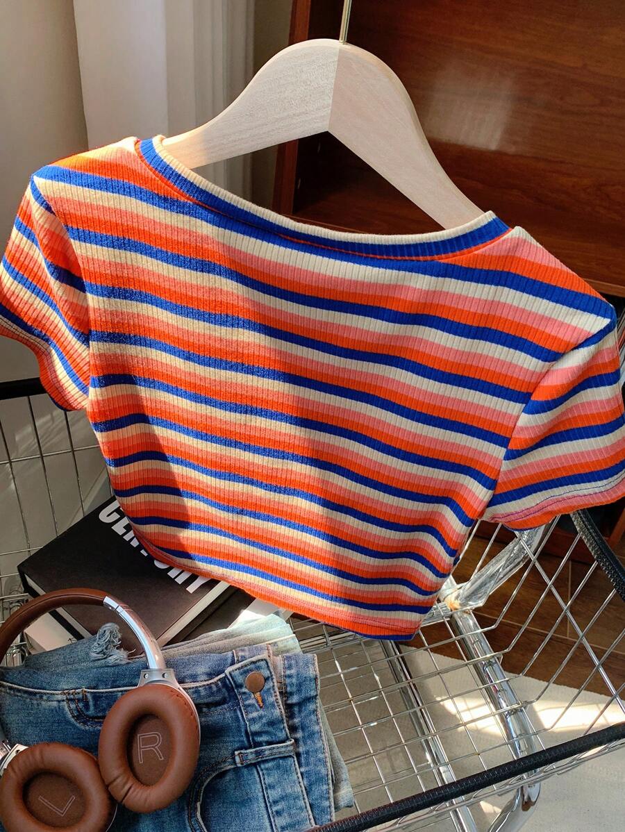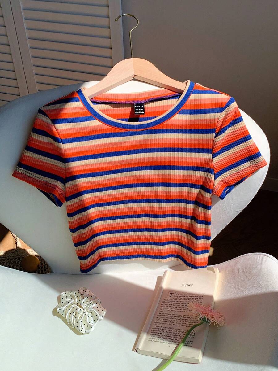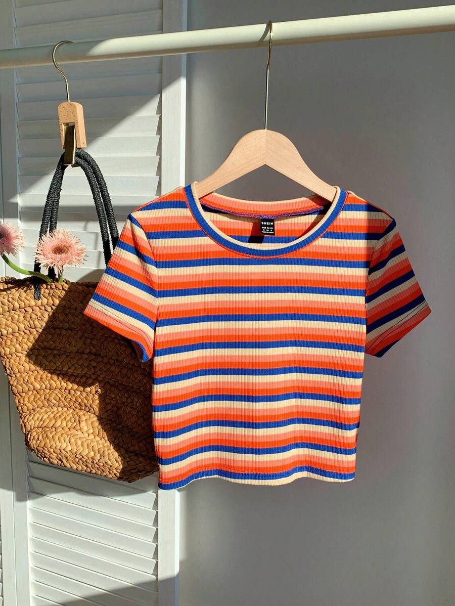Comfortcana Camiseta de punto ajustada de mujer con rayas de colores