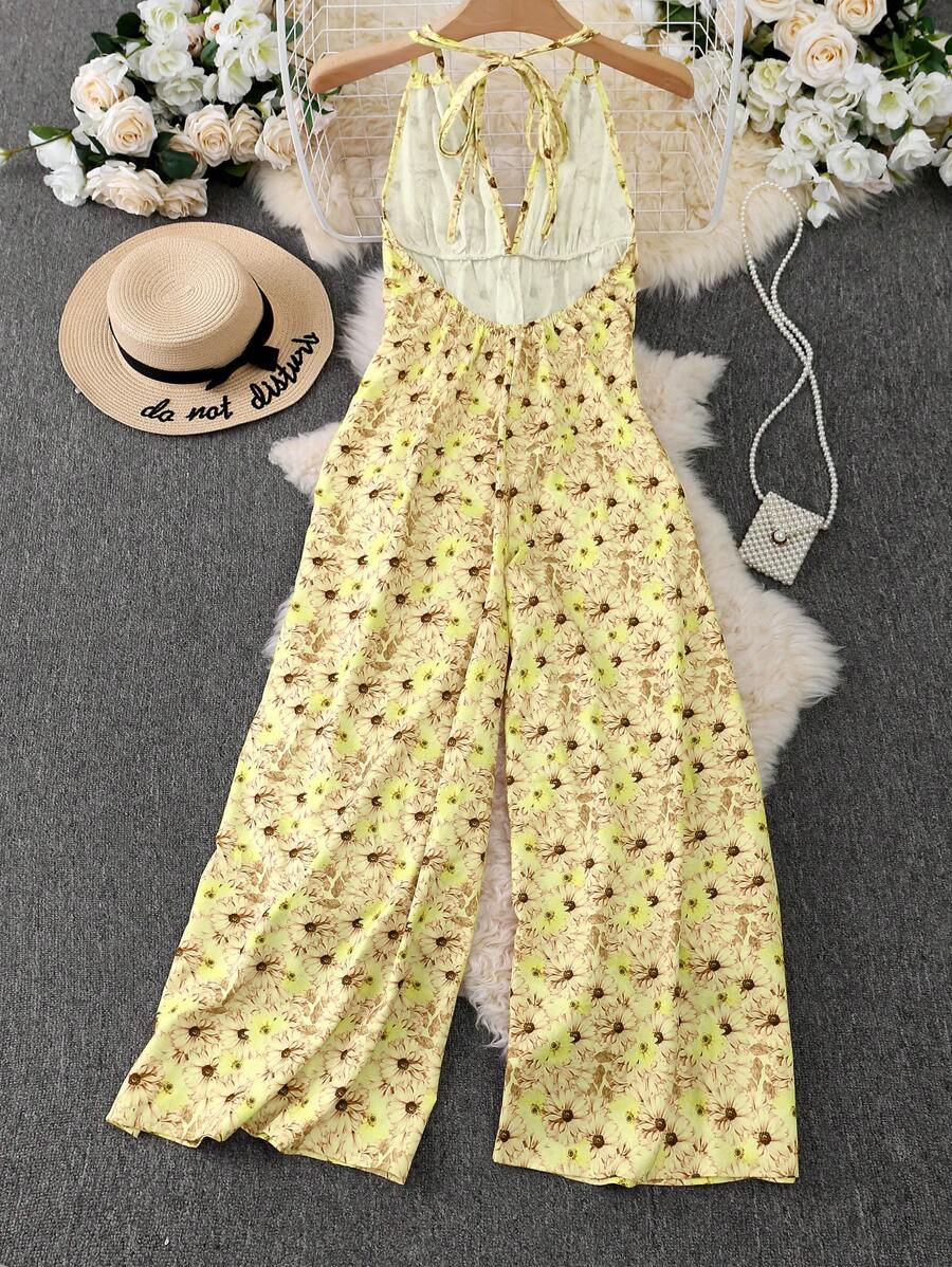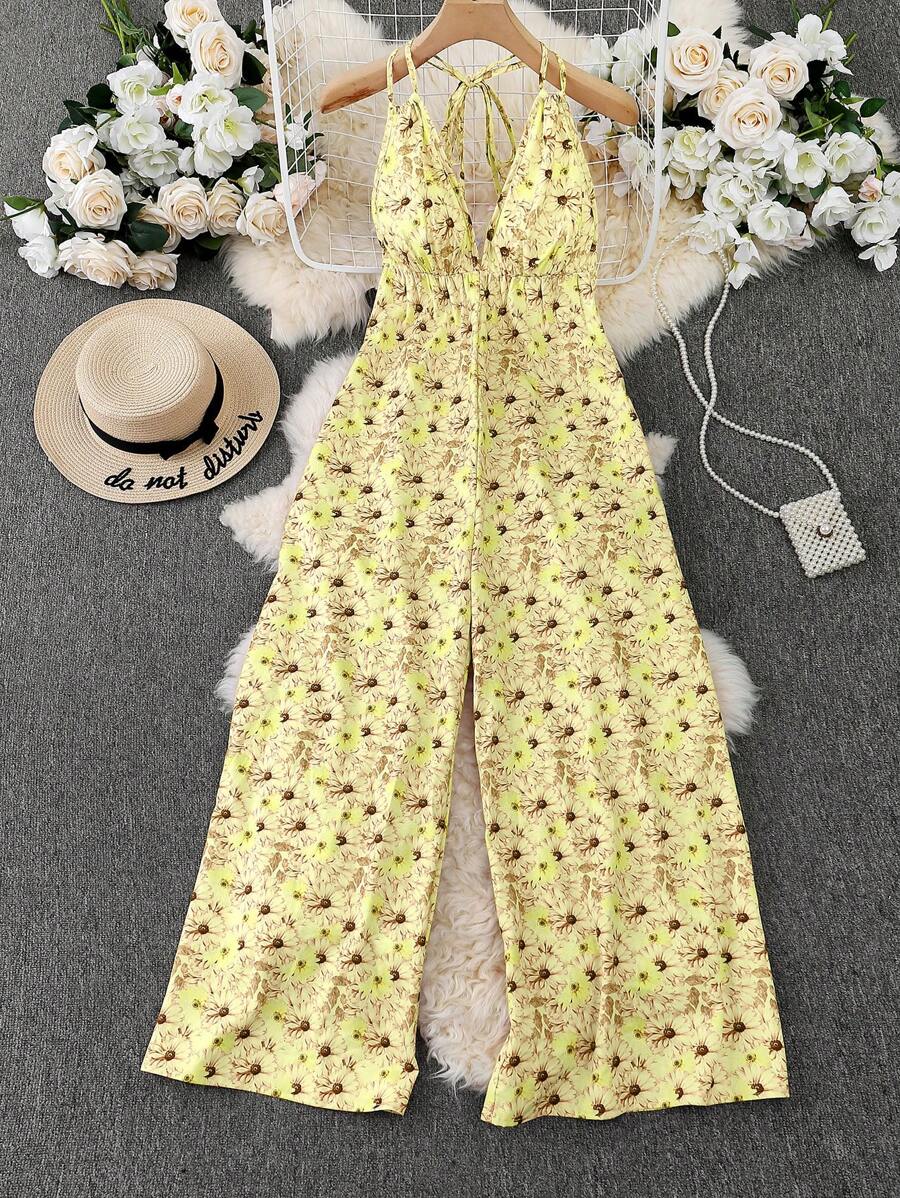 INAWLY Mono de pierna ancha de escote halter sin espalda con estampado, ropa de resort sexy para mujer