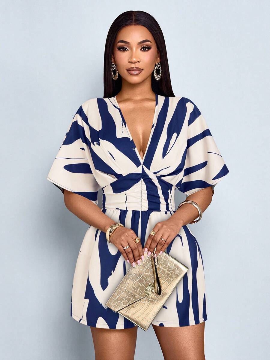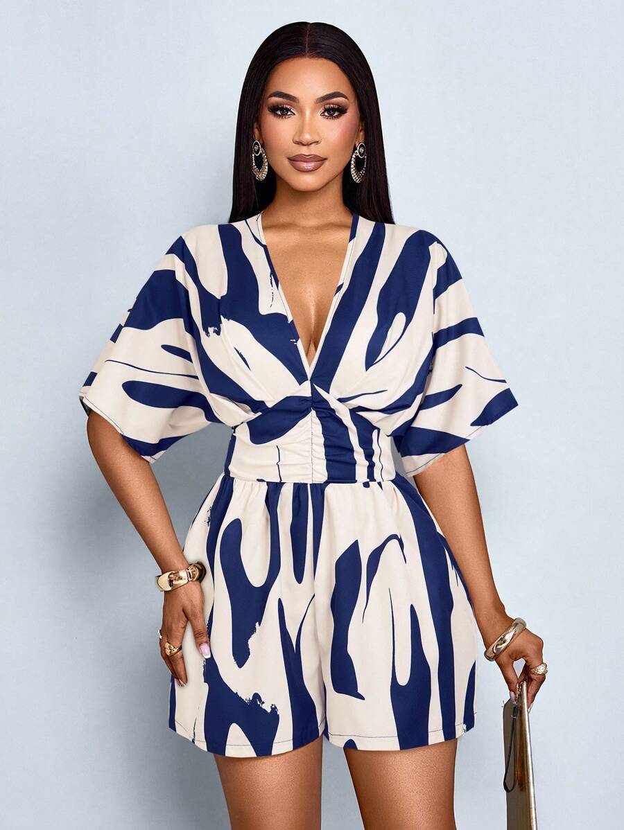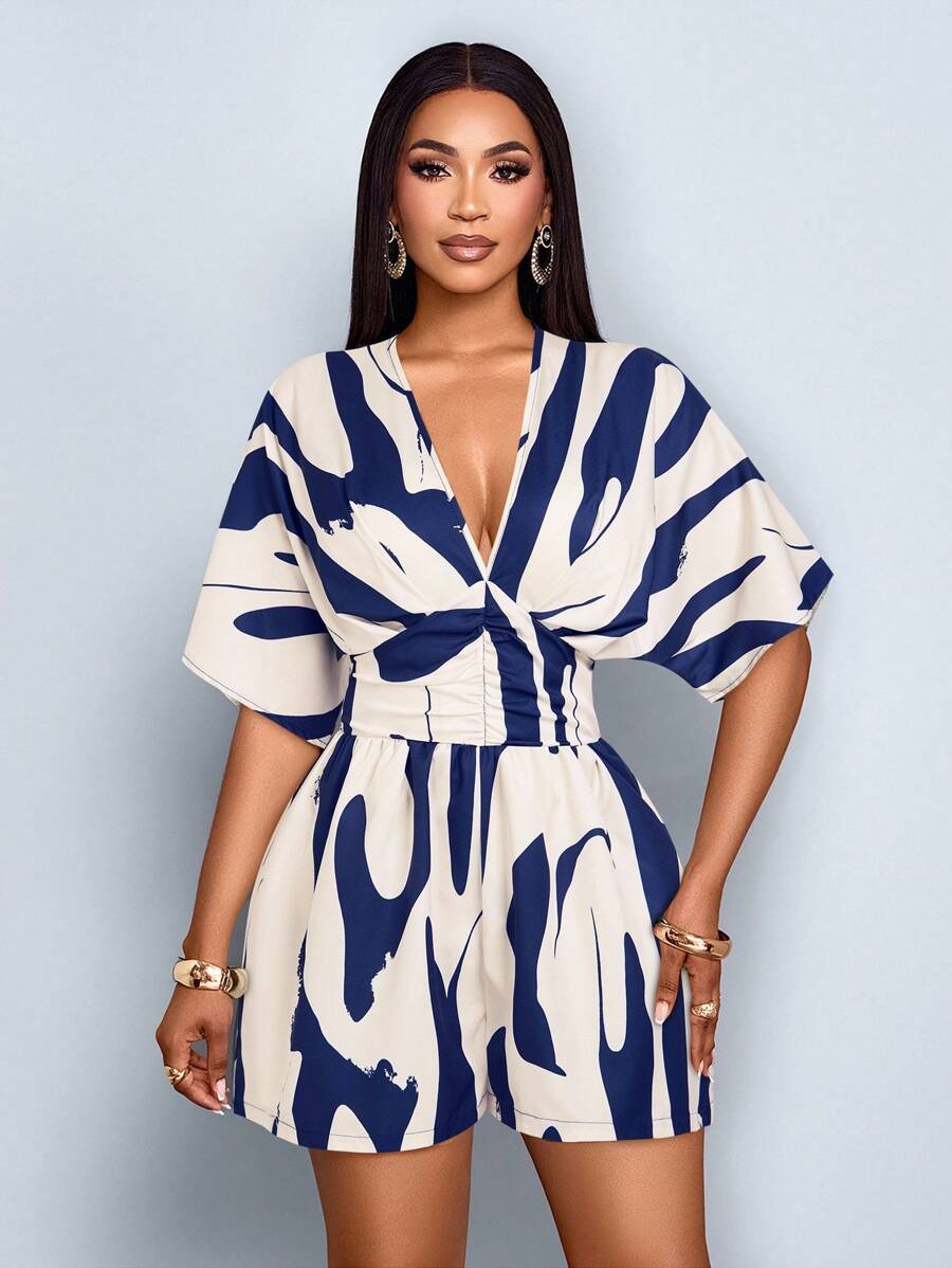 SOLERSUN Mono con estampado floral, cuello en V profundo, mangas tipo murciélago, cintura fruncida y plisada para mujer