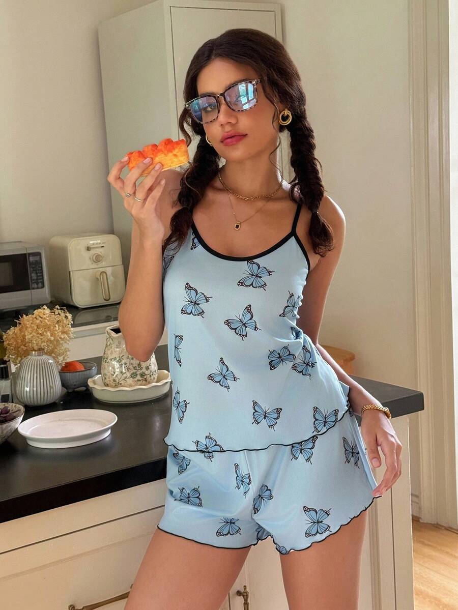 ZzzCrew Set de pijama de 2 piezas con camiseta de tirantes y pantalones cortos con estampado de mariposas, casual y juvenil
